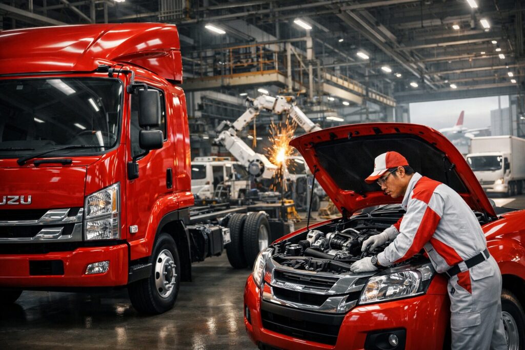 いすゞ自動車株式会社は、日本国内外において商用車(CV)、ライトコマーシャルビークル(LCV)、パワートレイン、および関連ソリューションの開発、製造、販売を主たる事業として展開する企業である。同社が公表した統合報告書2025および関連資料によると、2025年3月末現在における同社グループの連結従業員数の実績値は42,117人であり、いすゞ自動車単独の従業員数の実績値は8,804人であった 1。同社は世界100カ国以上において事業活動を展開しており、関連会社は27カ国において56拠点を有する体制を構築している 1。製品ラインナップとして、商用車事業部門では1959年に市場投入された小型トラック「エルフ」をはじめとし、中型トラック「フォワード」、大型トラック「ギガ」、およびバスシリーズである「エルガ」や「ガーラ」等の製造・販売を行っている 1。LCV事業部門においては、タイ王国を主要な生産および輸出拠点として位置づけ、1トン積ピックアップトラックである「D-MAX」や、乗用車派生モデル(PPV)である「mu-X」をグローバル市場に向けて展開している 1。また、パワートレイン事業領域では、自動車用のディーゼルエンジン技術を応用し、建設機械、農機、発電機等の産業用エンジン分野に対しても製品を供給している。ハードウェアの提供にとどまらず、車両データをオンラインで把握し運行管理や省燃費運転をサポートするテレマティクスサービス「MIMAMORI(みまもり)」や、車両データを活用した高度純正整備サービス「PREISM(プレイズム)」等のソリューション事業も推進している 1。