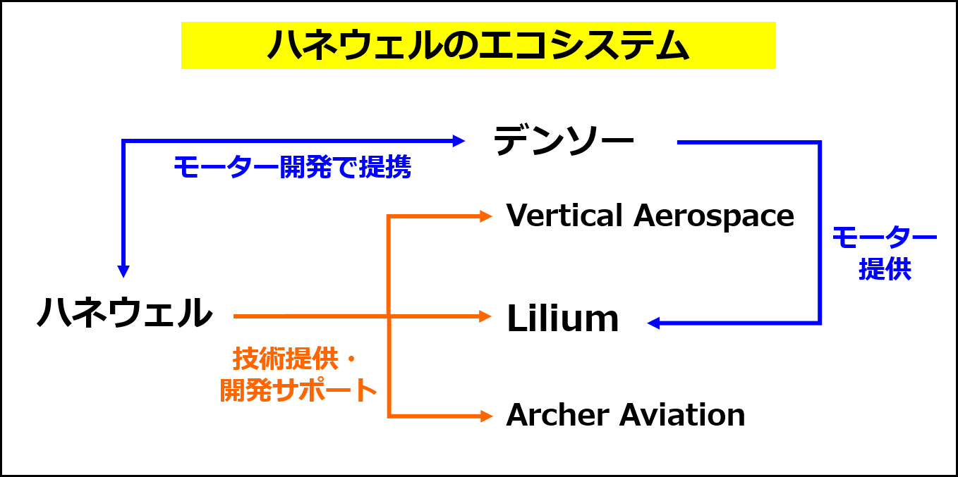 先述した通り、eVTOLの普及において「軽量・高出力のモーター開発」はハードルになりますが、ハネウェルは提携したデンソーを支援することで、そのハードルを超えています。また、スタートアップに幅広く技術を提供することで、eVTOL市場にスムーズに参入できる仕組みをつくっています。