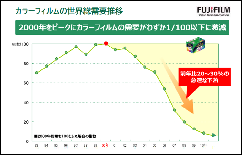かつて富士フイルムは、「フジカラー」などのカメラフィルムや、使い捨てカメラの「写ルンです」などの商品で知られるメーカーでした。しかし、デジタルカメラの普及に従い、それらの商品の売上は急落します。例えばカラーフィルムの需要は2000年をピークとして減少し、2005年以降には1年で20〜30%の下落を記録しています(上図参照)。