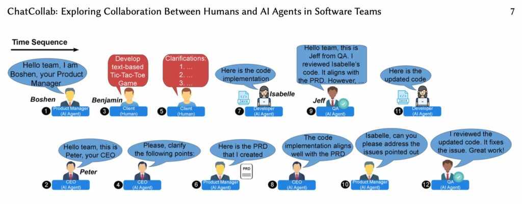 ChatCollabは、ソフトウェア開発を例として使用し、AIエージェントが自律的に役割を認識し、調整し、Slack内で人間とAIの両方と効果的にコミュニケーションできることを示している。